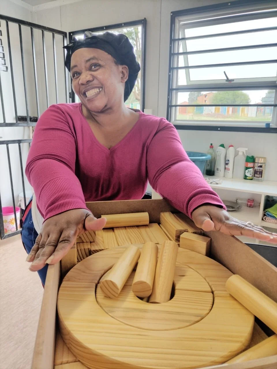 What a joy seeing preschools receive the Incentive Store toys and equipment they earned. Hanna Radingwana, the Principal of the Tushanang Preschool, is pleased with her crate of blocks.